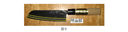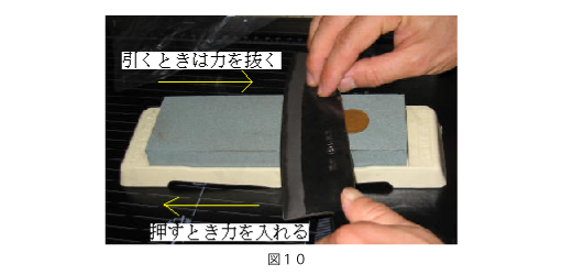 - 次に、荒砥石(#200〜600)上を上記の要領で地金部全体(図9参照)を網羅するように50回前後させます。(※押す時に力を入れるようにします。引くときは力を抜くようにしましょう。図10参照)