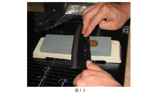 - 刃金部を研ぐ際は包丁の角度を10円玉が2枚はさめる程度傾けて研ぎます。(図12参照)