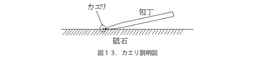- 刃金部を表裏繰り返し研いでいると刃先にカエリが出ます。カエリとは金属に限らず材料を削ったときに出る加工先端部がめくれた状態のことを言います。(図13参照)