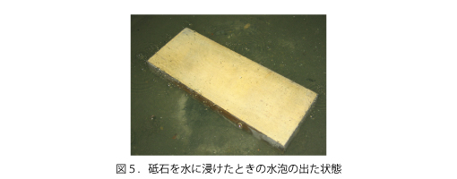砥石は、研ぎを行う前日に砥石全体を水に浸しておく必要があります。前日に浸し忘れたときは、砥石を水に浸したときに砥石から水泡が出なくなるまで浸しておきます(30分〜1時間程度)(図5参照)。