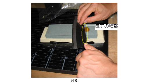 - 刃先全体(図15参照)にカエリを確認出来たら荒砥ぎ終了です。刃先に刃こぼれ、刃の欠けがある場合にはそれらがなくなるまで荒研ぎします。